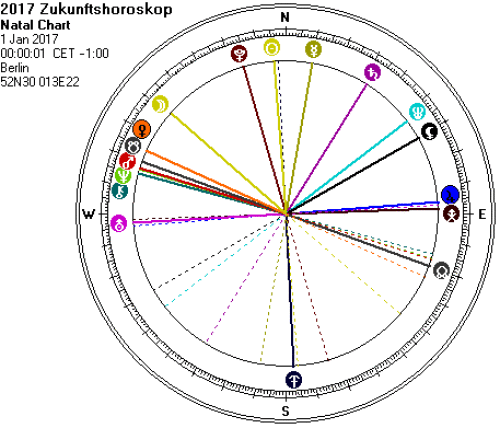 Hier sehen Sie das Neujahreshoroskop 2017. Die Verteilung der Planetenlinien kann unter anderem dazu genutzt werden, bestimmte Himmelsrichtungen, in 2017 z.B. Richtung Nord-Ost, zu schützen und zu reinigen. Hierfür empfehlen sich besonders Räucherungen, die negative Energien entfernen helfen und positive "Schwingungen" hinterlassen.